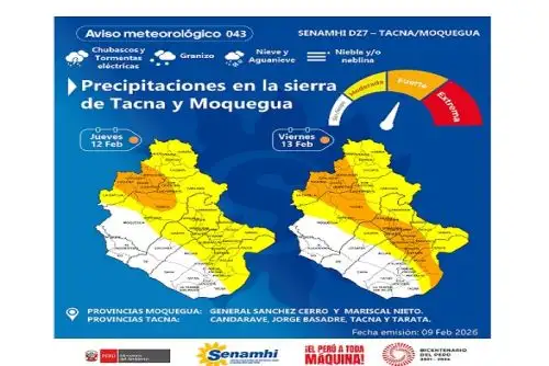 El Senamhi informó que entre el jueves 12 y domingo 15 de febrero, se prevé la ocurrencia de precipitaciones de moderada a fuerte intensidad en la sierra de Tacna y Moquegua, acompañadas de descargas eléctricas y ráfagas de viento.