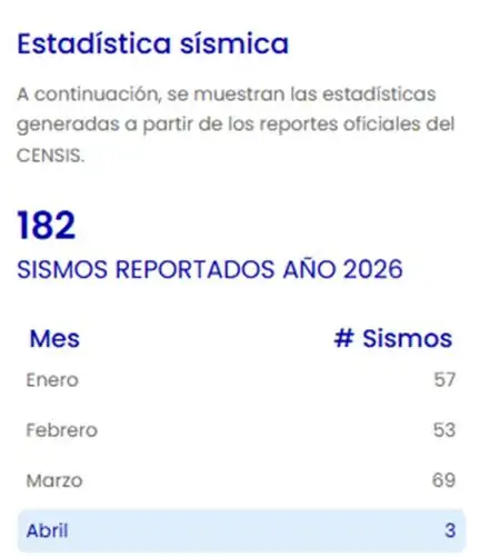 El mes que registró el mayor número de sismos en lo que va del año es marzo con 69 eventos, seguido de enero con 57, febrero con 53 y abril con 3 temblores reportados por el Censis del IGP.
