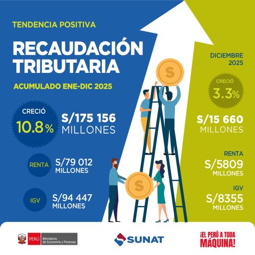 Sunat: ingresos tributarios sumaron S/ 175,156 millones y crecieron 10.8% en el 2025