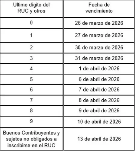 Cabe precisar que el plazo final para que los negocios o empresas presenten su declaración, no habrá prórrogas, iniciará esta semana y culminará el próximo 13 de abril del 2026. Las fechas de vencimientos consideran el último dígito del RUC del contribuyente.