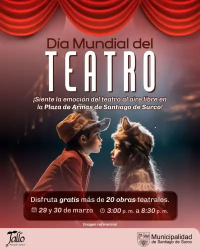 En el marco de las celebraciones por el Día Mundial del Teatro, el público de todas las edades podrá disfrutar de hasta 20 obras de teatro con funciones gratuitas este sábado 29 y domingo 30, en la Plaza de Armas de Santiago de Surco, ubicada en Surco Pueblo.