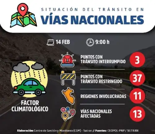 Suman 37 los puntos de la red vial con tránsito restringido y tres con circulación interrumpida hasta ahora en 13 vías nacionales situadas en once regiones del país debido a huaicos, deslizamientos, derrumbes, erosión y otras emergencias derivadas de las intensas lluvias que se registran en el país, informó la Superintendencia de Transporte Terrestre de Personas, Carga y Mercancías (Sutran).