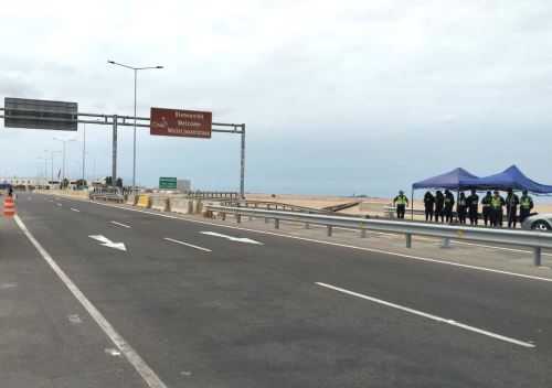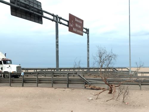 Los oficiales se ubican en ambos carriles de la via fronteriza que une a los complejos Santa Rosa (Perú) y Chacalluta (Chile), sin embargo, no se aprecia presencia de migrantes varados en la zona, es decir, la carretera luce despejada y el tránsito vehicular es normal.