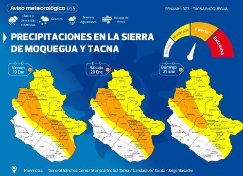 El pronóstico en la región Tacna alcanza a los distritos de Candarave, Camilaca, Cairani, Huanuara, Curibaya, Quilahuani, Tarata, Ticaco, Tarucachi, Estique Pampa, Estique, Héroes Albarracín, Sitajara, Palca, Pachía, Alto de la Alianza, Ciudad Nueva, Calana, Pocollay, Inclán, Ilabaya y Locumba.