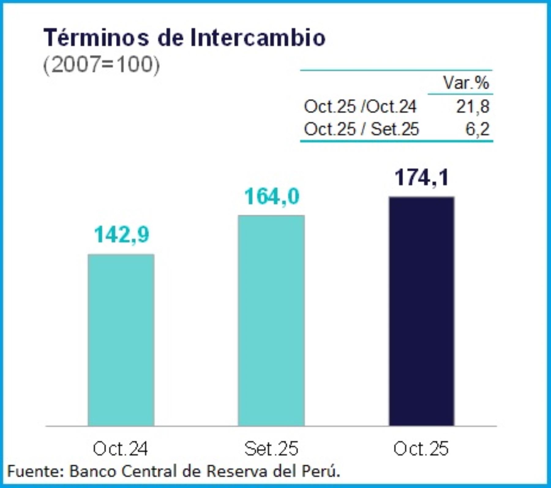 En octubre de 2025, los términos de intercambio, indicador que muestra la relación entre los precios de las exportaciones y los de las importaciones, registraron un incremento de 21.8% frente al mismo mes de 2024, indicó hoy el Banco Central de Reserva del Perú (BCR).