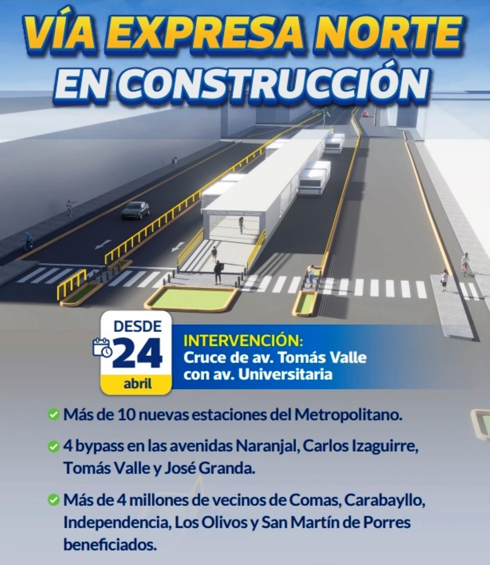 Para la ejecución del proyecto, se intervendrá la berma central de la Av. Tomás Valle, donde se construirá un viaducto. Asimismo, se verá afectado un carril adyacente a la berma central, lo que implicará un cierre parcial en la intersección con la Av. Universitaria.