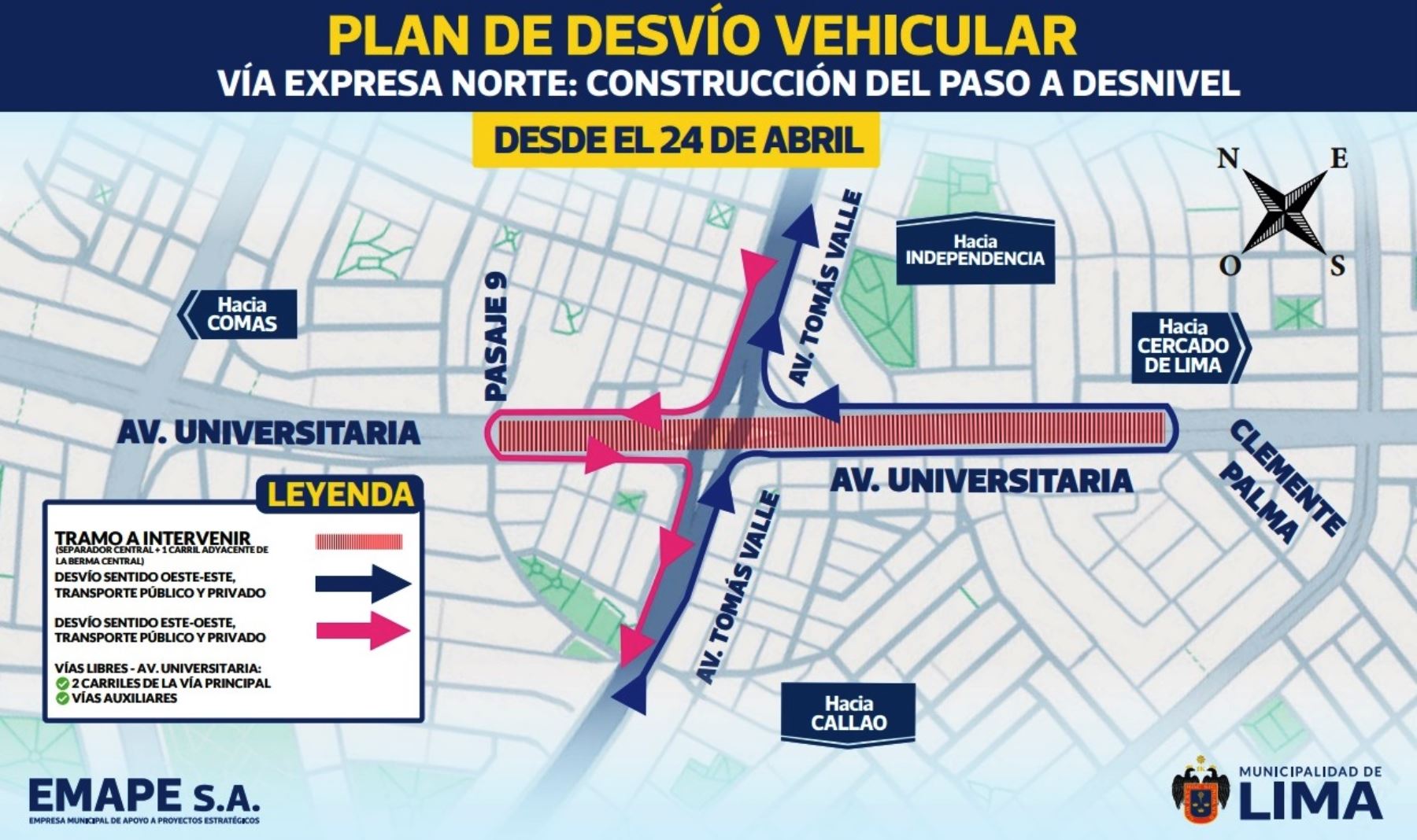 -Av. Tomás Valle: el flujo vehicular será desviado por dos carriles habilitados mediante la adecuación del separador central de la Av. Universitaria, en el inicio de las rampas proyectadas del paso a desnivel.