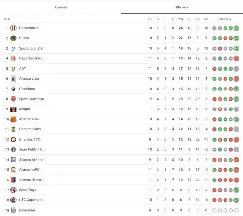 La tabla de posiciones del Torneo Clausura de la Liga 1 2025 tuvo algunos cambios y es que tras el triunfo de Cusco FC ante Deportivo Garcilaso se acortaron las distancias con el líder Universitario, que este miércoles saldrá a enfrentar a Alianza Atlético en Trujillo.