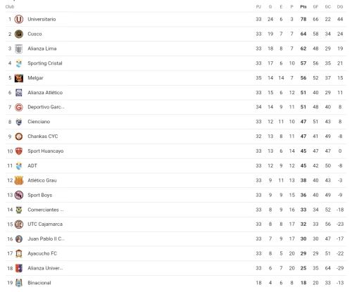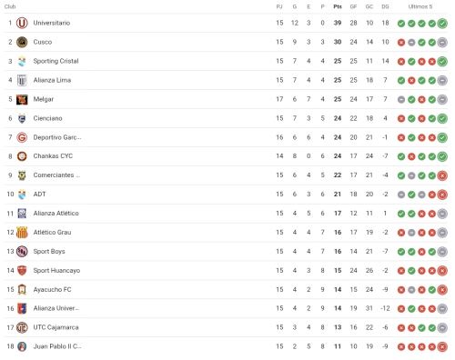 Así, Cristal, Alianza y Melgar quedan empatados con 25 puntos en tercer, cuarto y quinto lugar respectivamente, aunque los de Arequipa tiene dos partidos jugados más, por lo que el cupo para la Libertadores parece difícil.