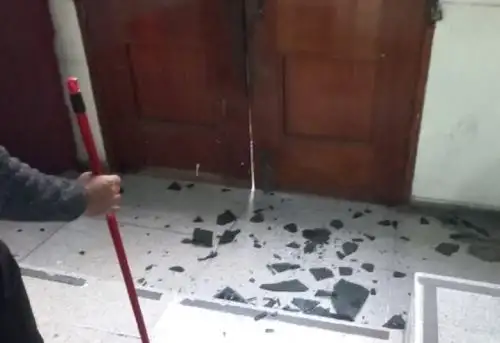 Totalmente destruidas terminaron los vidrios de la puerta lateral del Palacio Municipal de Trujillo, ubicado en la cuadra cinco del jirón Almagro, en el centro de la ciudad, tras sufrir el ataque de un grupo de seguidores del suspendido alcalde César Arturo Fernández Bazán.
