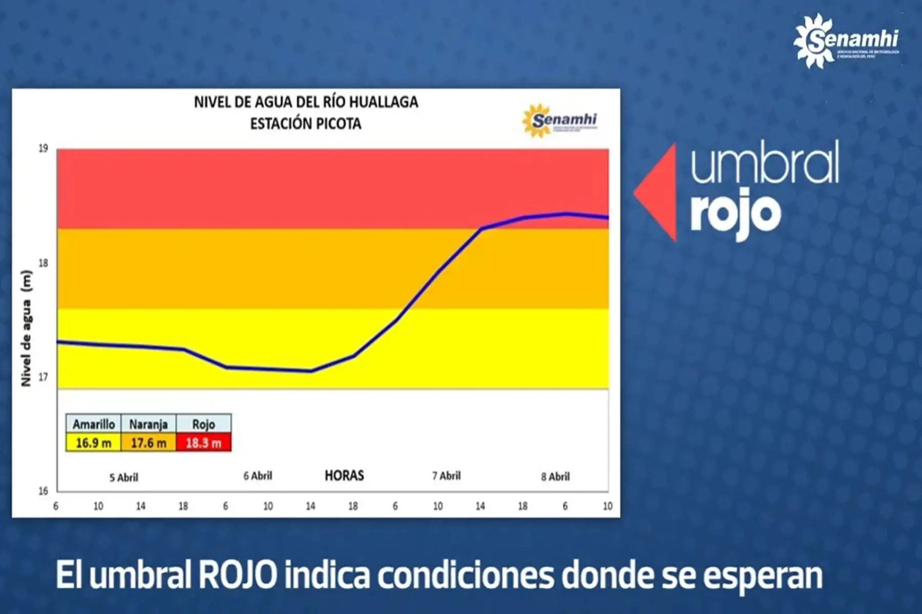 El umbral rojo indica una situación de mayor riesgo. En este escenario se esperan posibles inundaciones en zonas pobladas y agrícolas ubicadas en áreas bajas, así como erosión de márgenes y afectación de infraestructura cercana al río.