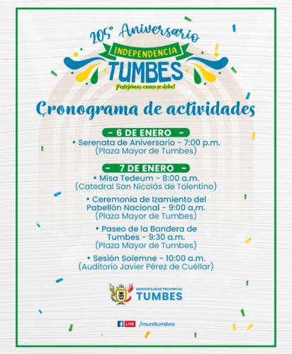 El programa de actividades celebratorias del 205 aniversario de Tumbes contempla una serenata realizada ayer, 6 de enero, en la Plaza de Armas de Tumbes, desde las 7:00 p.m.