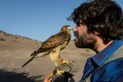 "Un ave rapaz no es una mascota. El ave no va a venir a hacerme cariños. Somos más bien compañeros de cacería", dice. Y de vuelo. Porque al menos tres o cuatro tardes a la semana, los dos se instalan en el auto de Marinkovic y suben por un camino empinado y polvoriento hasta un cerro en el norte de Santiago para volar.