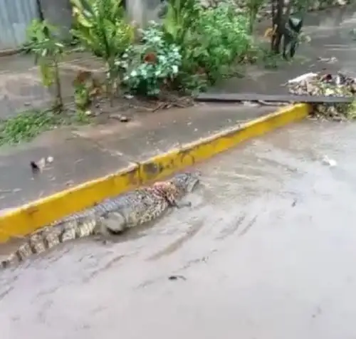 La aparición de un lagarto en plena zona urbana de la ciudad Pucallpa sorprendió este jueves 2 de octubre a los vecinos de la capital de la región Ucayali, tras una lluvia intensa que provocó la activación y desborde de caños naturales que dejó varias calles inundadas.