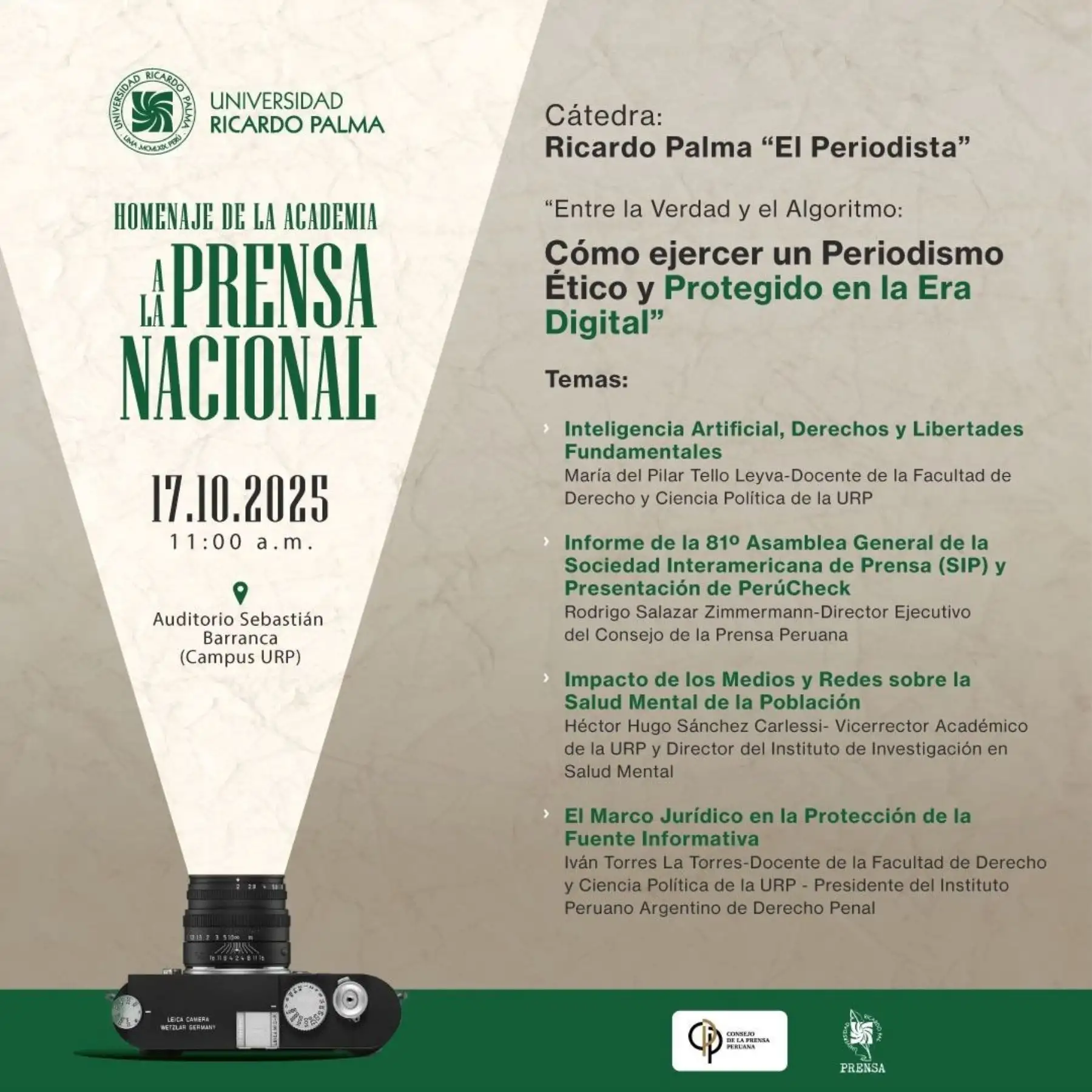 La Universidad Ricardo Palma rendirá homenaje a la prensa nacional con el foro “Entre la Verdad y el Algoritmo: Cómo ejercer un periodismo ético y protegido en la era digital”, que se llevará a cabo el viernes 17 de octubre, a las 11:00 a. m., en el auditorio “Sebastián Barranca” de esta casa de estudios. El ingreso será libre.