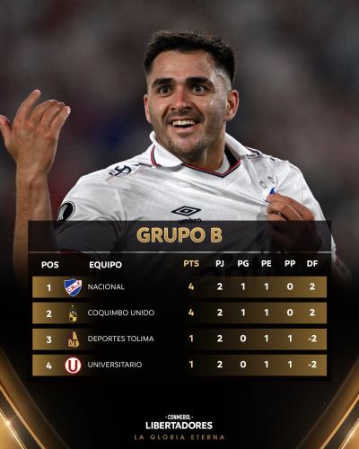 Con este resultado negativo, Universitario se quedó con un 1 punto y aparece en el último lugar. Tiene el mismo puntaje que el penúltimo Deportes Tolima (1), que viene de caer 3-1 con el líder Nacional de Uruguay (4 puntos). Coquimbo Unido se ubica segundo, con 4 unidades.