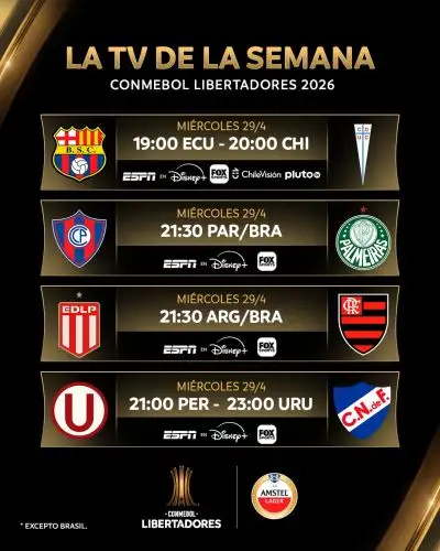 El encuentro de la tercera jornada del Grupo B de la Libertadores, que se jugará en el Estadio Monumental, será transmitido en directo por cadena internacional ESPN, que se emite por las operadoras de cable Directv, Movistar TV y Claro TV. También estará disponible por el streaming Disney+.