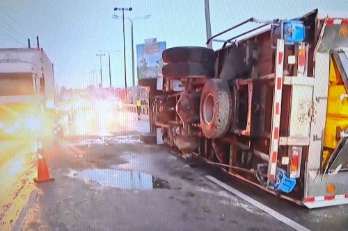 Una intensa congestión vehicular se registra en el kilómetro 16 de la Panamericana Sur, en el distrito de Villa El Salvador, a causa de la volcadura de un camión frigorífico que transportaba jabas de pota, obligando a cerrar dos de los tres carriles de dicha vía en el sentido de sur a norte.