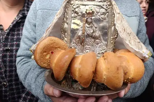 La Señorita exquisita, hermosa filigranita, como dice la canción de los danzarines de qhapaq negro, salió cubierta con plásticos transparentes del templo colonial Nuestra Señora del Rosario para bendecir a su pueblo que no olvida aquel acontecimiento.