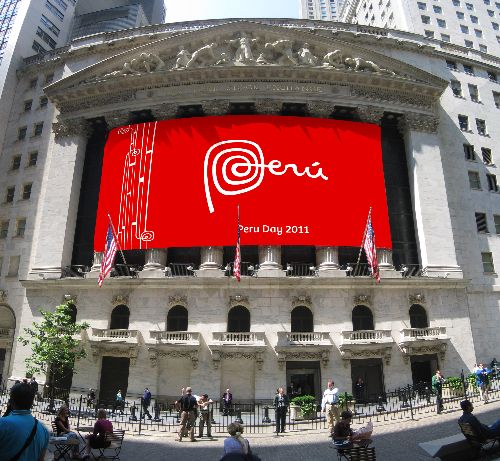 La Bolsa Valores de Nueva York (NYSE), mundialmente conocida como Wall Street, se vestirá mañana (viernes) con el logo de la Marca País en el marco del "Peru Day" y como parte de las actividades de su campaña de difusión a nivel internacional, informó hoy la Comisión de Promoción del Perú para la Exportación y el Turismo (Promperú).