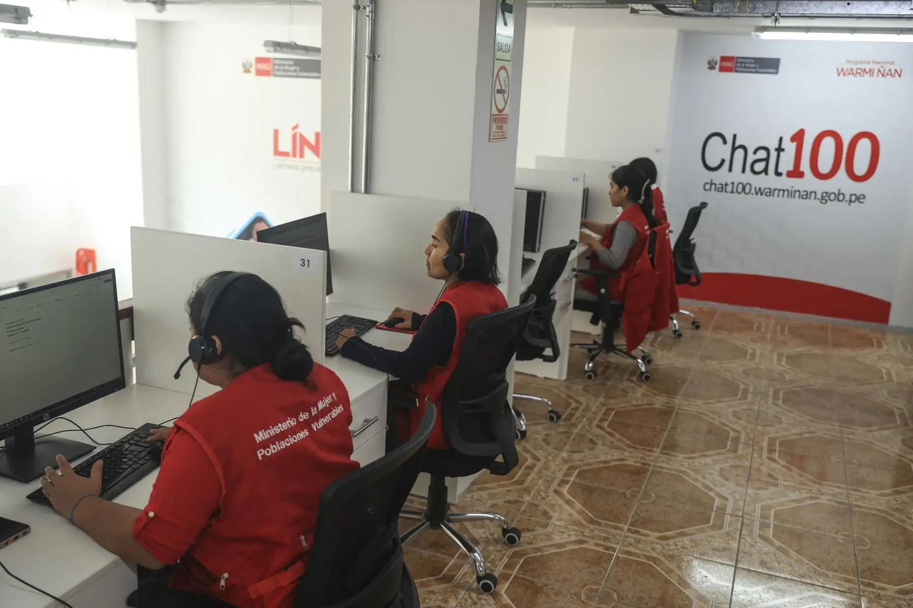"Nosotros atendemos en castellano, quechua y aimara. También tenemos nuestro personal del Chat 100, que garantiza el servicio las 24 horas del día", expresó en el primer piso del edificio donde se realiza las funciones de atención, prevención y lucha contra los casos de violencia.