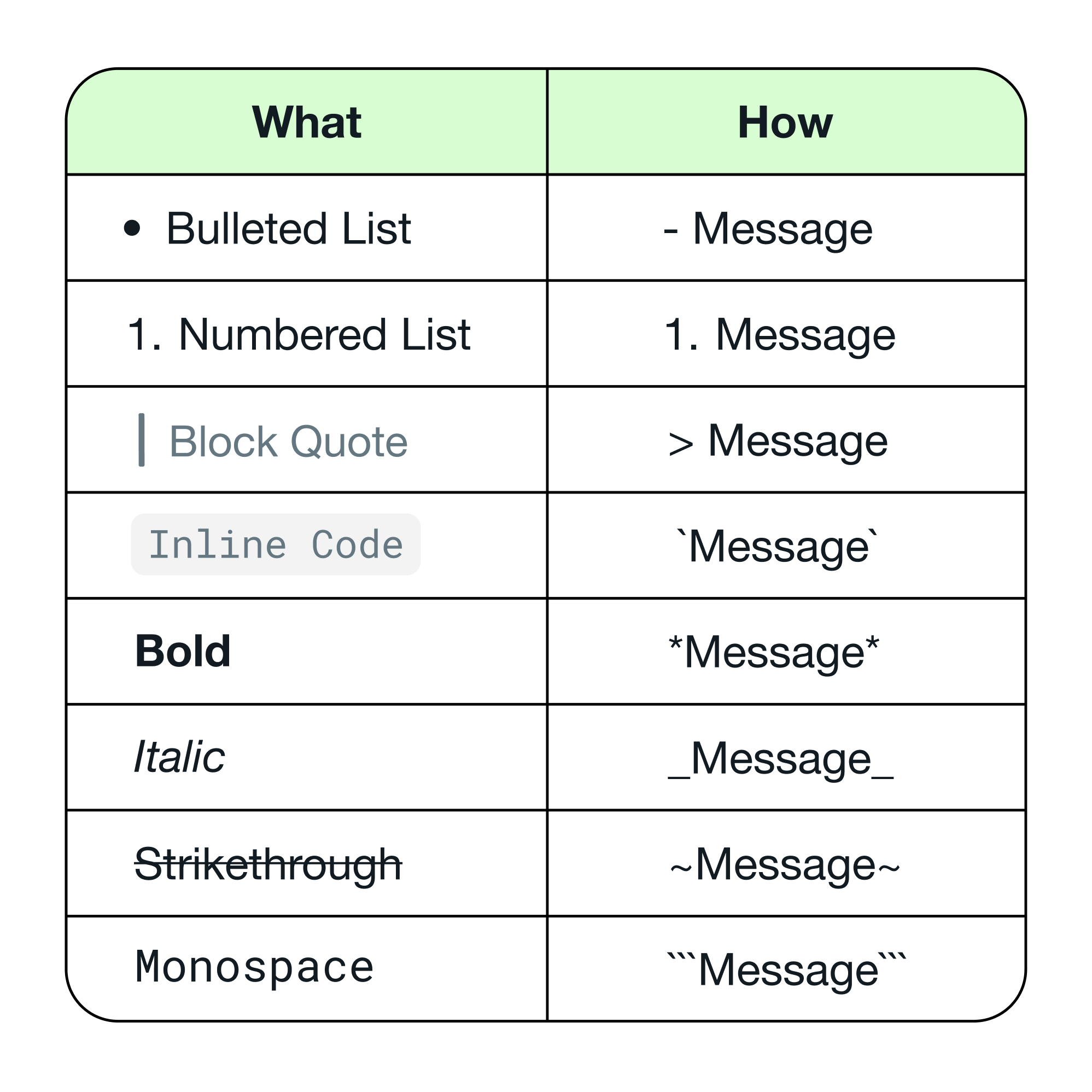 Para añadir un código alineado: Se coloca un acento grave en ambos lados del mensaje (`texto`)