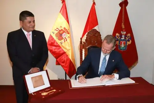 El alcalde de Arequipa, Víctor Hugo Rivera, fue el encargado entregar las llaves de la ciudad blanca al monarca, quien, a su vez, saludó a los miembros del concejo municipal y firmó el libro de visitas.