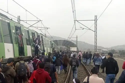 A través de varias imágenes difundidas en redes sociales, pasajeros del tren dieron a conocer la inamovilidad del tren y la impaciencia de los usuarios esperando que el vehículo ferroviario logre avanzar para llegar a sus destinos.