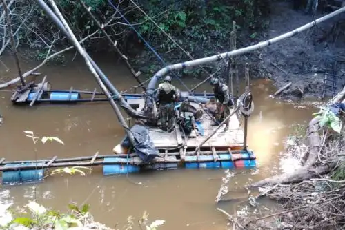 The authorities found three rustic camps, 10 engines, 7 rafts, 7 suction pumps, 7 hoppers, 4 batteries, 1 electric generator, 160 gallons of diesel fuel, 3 strakes, and 5 grams of gold, as well as tools.
