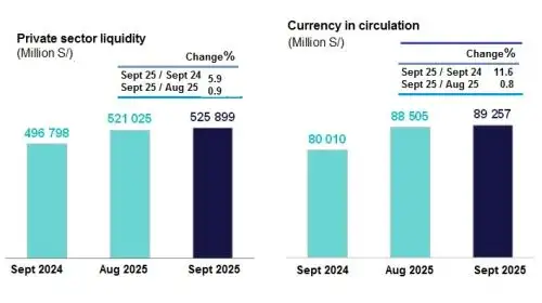 In monthly terms, liquidity increased by 0.9% in September, corresponding to a 0.8% increase in currency in circulation and a 1% change in deposits.