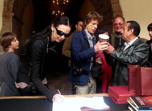 Jagger estuvo por casi una hora y media en la Casa Concha, y recibió allí un plato de cerámica, un kero (vasija incaica), un niño Manuelito (artesanía típica) y un libro sobre la provincia de Espinar, de manos de las autoridades cusqueñas.